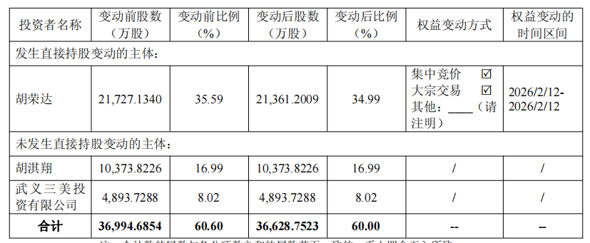 中国经济网北京2月13日电 三美股份(603379.SH)昨日晚间发布公告称,控股股东及连带股东股本变动达到5%水平。公司表示,于2026年2月12日收到大股东、实际控制人胡荣达先生出具的《关于持有三明股份数量减少及控股股东、共同股东持股变动触及5%大关的通知》。2026年2月12日,胡荣达先生合计减持公司股份1股。通过集中竞价操作和大宗操作持有公司股份3,659,331股,占公司总股本的0.60%。本次减持后,胡荣达及其共同持有公司股份的合计比例由60.60%下降至60.00%,股本波动达到5%大关。根据昨天的数据以68.79元的股价计算,胡荣达本次减持的现金金额约为2.52亿元。本次股本变动系信息披露义务人胡荣达实施此前披露的减持股份计划所致。详情请参见公司于2025年11月11日披露的《关于拟减持控股股东股份的公告》。本次股本变动与此前披露的披露义务计划及承诺一致。截至本公告日,记者的减持计划尚未完成。本次资本变更不会导致我们的大股东或实际控制权发生变化,也不会对我们的治理结构和持续经营产生重大影响。胡荣达为本公司控股股东及实际控制人,胡其祥、武威三美投资有限公司为本公司的配合人胡荣达. 11日下午,三美股份披露了《关于控股股东及联席发起人股本变动达到1%大关的提示性公告》。 2026年1月23日至2026年2月11日,胡荣达先生通过密集竞价交易和大宗交易合计减持公司股票795.78万股,相当于公司总股本的1.30%。减持后,胡荣达先生及其联系人持有公司股份的合计比例由61.90%下降至60.60%,资本波动达到1%大关。按照减持期间股价均价68.35元计算,现金总额约为543,915,630元。据新浪财经显示,胡荣达先生最初持有2.31亿股,占总股本的37.83%。 2025年8月1日至2025年9月25日,胡荣达先生减持公司股份本次增持股份共计 568.48 万股,折算现金共计约 3.09 亿元。经测算,胡荣达共计兑换现金约8.53亿元。