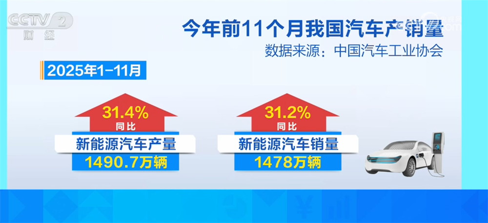 央视网消息:12月11日,中国汽车工业协会发布最新数据显示,2025年前11个月我国汽车产销量突破3100万辆,同比实现两位数增长。我们一起来看看吧。最新数据显示,2025年1月至11月,日本汽车产销量分别为3123.1万辆和3112.7万辆,比上年增长11.9%和11.4%。其中,新能源汽车产量1490.7万辆,销售1478万辆,分别比上年增长31.4%和31.2%。中国汽车工业协会副秘书长陈世华表示:“11月份汽车产量单月首次突破350万辆,创历史新高。特别是新能源汽车持续实现高增长,国内新车销量占比es连续五个月稳定在50%以上。单月出口量也突破70万台,继续刷新纪录。 “受出口增长拉动。此外,受老旧卡车提前报废和更新政策影响,近期国内商用车市场持续复苏,连续几个月录得同比高增长。随着年底临近,购车相关的各项政策变化影响愈加明显。”陈士华表示,企业汽车企业利用年底“新车换购税减税”和“能源”政策的宽限期,生产供应继续保持较快增长步伐。预计全年我国汽车产销量将突破3400万辆。