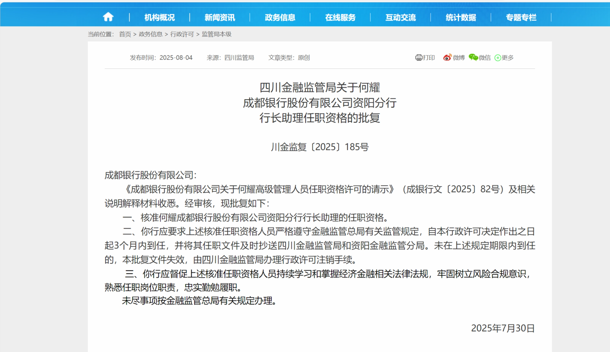8月4日,四川金融法规办公室发布了“ Yao Chendu Bank Co. Ziyang Branch总裁的资格认可”。 (Chuanjin Jianfu [2025] No. 185),He Yao Chengdu Bank Co.,Ltd.