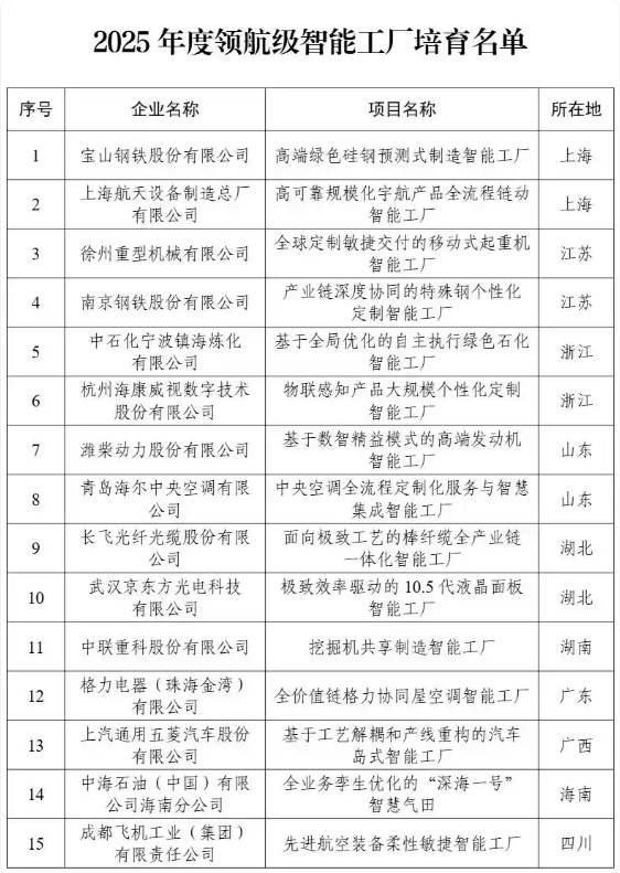 文/冯玲玲 工业和信息化部等六部门11月27日正式公布首批15家试点级智能工厂,覆盖装备制造、原材料、电子信息、消费品等多个重点行业。什么是试点级智能工厂?工信部相关负责人介绍,试点级智能工厂融合了新一代信息技术、先进制造技术、精益管理理念等,再现了我国智能制造的最高水平。随着首批15家智能企业的公布试点工厂,我国智能制造体系正在迈出重要飞跃。在数字化、网络化的基础上,我们将迈向以人工智能全面应用为特征的智能化新阶段。资料来源:工信部官网,正在打造“金字塔”智能工厂。试点层面的智能工厂设计和建设源于今年6月工信部等六部门联合启动的智能工厂梯度培育行动。本次倡议依据《智能工厂倾斜作物要素条件(2025年版)》,将智能工厂分为基础级、先进级、优秀级、试点级四个等级。中国电子信息产业发展研究院新型工业化实验室主任王苏在发布会上表示采访中了解到,这四个层次分别对应了企业智能制造发展路径的不同阶段。这种分层设计重点单一,目标明确,为您的业务智能化转型提供明确的方向。具体来说,基础层面主要针对初创企业,引导其完成从“有设备”到“用数据”的根本转变。该级别鼓励企业自我评估和建设,降低门槛,我们的目标是提高智能转型的采用率,让更多的企业迈出智能转型的第一步。在高级阶段,企业必须实现系统集成,并在行业内具有一定的影响力。这一级别是由地方当局和企业集团组织确定的,强调地方示威的作用。卓越级要求企业具备智能优化能力并成为国家示范领导人。 Pilot级别作为最高级别,重点探索未来制造模式,强调“全球领先”的目标和人工智能的综合应用。卓越级和试点级均通过专家评审、现场检查等严格机制评选,确保高品质和行业领先。最高标准引导行业走向新方向。 《智能工厂梯度培育系数条件(第20版)25)》为试点级智能工厂设定了严格的“准入标准值”,要求试点级智能工厂在建设绩效等重要技术经济指标上处于全球领先水平。其中,人工智能技术应用场景占比超过60%,远超20%的卓越要求。试点级智能工厂建设内容应涵盖五个方面s:工厂建设、研发/设计、生产运营、生产管理、运营管理。从技术融合的角度来看,试点工厂需要实现的包括人工智能与制造的深度耦合,工业互联网+数字孪生+IT基础设施的融合应用,以及从产品生命周期到整个供应链各个环节的协同。技术融合的深度决定了中试级工厂的核心竞争力。以此次入选的南科为例。使用数字孪生和人工智能支持特种钢的定制生产。订单准时完成率达到98.5%,新产品开发周期较之前机型缩短了50%。徐工通过人工智能驱动的制造和研发模式为全球客户提供服务。我们提高定制能力并将订单交付周期缩短 55%。除了技术进步,试点工厂还实现了运营和商业模式的创新。这些工厂往往开发运营管理智能,并对营销、产品的服务和供应链管理等关键流程进行非人性化和非人性化。生产过程可实现零浪费、零库存、零排放,形成可持续的低碳、共享、净零制造模式。同时,试点工厂还通过“母工厂+复制推广”机制,引领产业链上下游协同创新。王苏表示,试点级工厂将主要聚焦高端装备、核心零部件、新一代信息技术等战略产业。这些不仅体现了我国的技术领先地位,也是进口的重要平台。游走中国制造在全球价值链中的地位。这些将有助于中国制造业打造全球标杆,成为创新扩散中心,支持高水平产业自主经营,引导资本和政策导向。我国智能工厂建设取得显著成绩的背后,是第一批试点级工厂的诞生,这将推动更多企业走向智能化。官方数据显示,“十四五”以来,我国已建成3.5万多个基层、7000多个高级、230个卓越级智能工厂,形成了智能化转型的坚实基础。例如,对数百家高性能工厂进行了改造升级,产品开发周期平均缩短28.4%,生产效率平均提高22.3%,废品率平均降低50.2%,减少约50%的废品率。碳排放量平均减少20.4%。智能化转型的价值得到充分验证。是的,但是,如何鼓励更多企业向智能工厂转型,仍然是一个亟待解决的问题。值得一提的是,智能工厂不仅仅是大公司的问题。据统计,日本超过50万家定点制造企业中,中小企业占大多数,其中以私营企业为主。他们是我国制造业转型升级的关键力量。但对于这些企业来说,智能工厂建设仍面临资金、技术、人力资源等方面的挑战。中国电子信息产业发展研究院产业政策研究所副研究员李木斋认为,政府引导、供给权威、龙头引领、逐步发展是关键。推动企业向智能工厂转型的关键。具体来说,政府应发挥主导作用,通过政策支持帮助企业明确智能化现代化的方向和路径。同时,要加强智能制造装备、工业软件及系统等开发利用,加快培育智能制造系统解决方案提供商。要发挥龙头企业引领作用,形成大中型、中小企业协同的产业生态圈。企业自身也应:根据业务发展需要,通过逐步更换或改进制造环节和流程,积累经验,逐步向更高水平的智能工厂迈进。