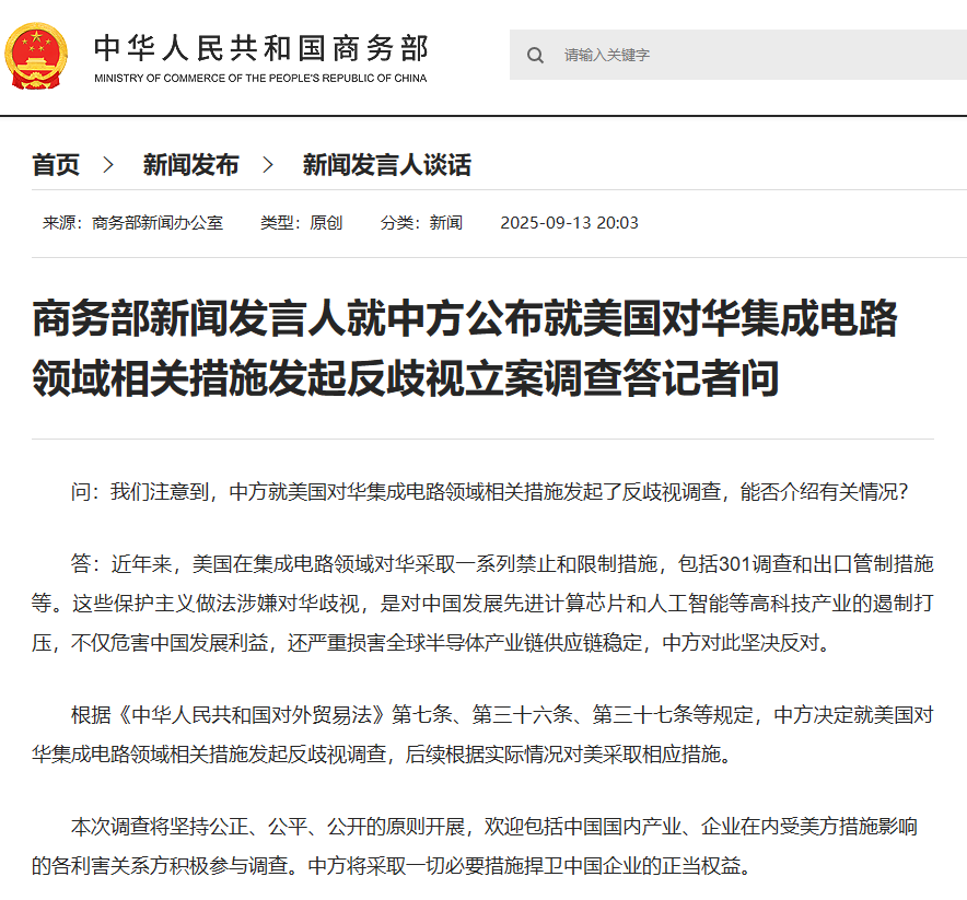 问:我注意到中国已经对中国综合电路领域的相关措施进行了非歧视调查。您可以介绍相关情况吗?答:近年来,美国在综合巡回赛地区的中国获得了一系列禁令和限制,包括301次调查和出口控制措施。这些贸易保护主义实践涉嫌歧视中国,是对高科技行业(例如Adva)中发展和镇压的抑制nced计算机芯片和人工智能。中国不仅对危险的发展兴趣,而且还严重破坏了产业链和全球半导体供应链的稳定性。中国坚决反对这一点。根据第7条,中国中国共和国第7、37、37条,决定开始对综合电路领域对中国相关措施的歧视,从那时起,它根据真实的条款采取了相应的针对美国的措施。这项研究遵守公平,公平和开放性的原则。包括中国国家行业和公司在内的所有感兴趣的各方都可以积极参与调查。中国将采取所有必要的措施来捍卫中国公司的合法权利和利益。网站屏幕截图