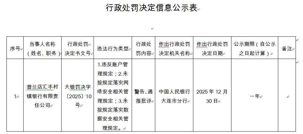 中国经济网北京1月6日电 中国人民银行大连分行近日发布行政处罚决定信息公开表(大银行2.未按规定落实网络安全相关管理标准。3.未按规定落实数据安全相关管理标准。中国人民银行大连分行对此予以警告和批评。大连普兰店汇丰村镇银行由香港上海汇丰银行独立设立。原文如下。
